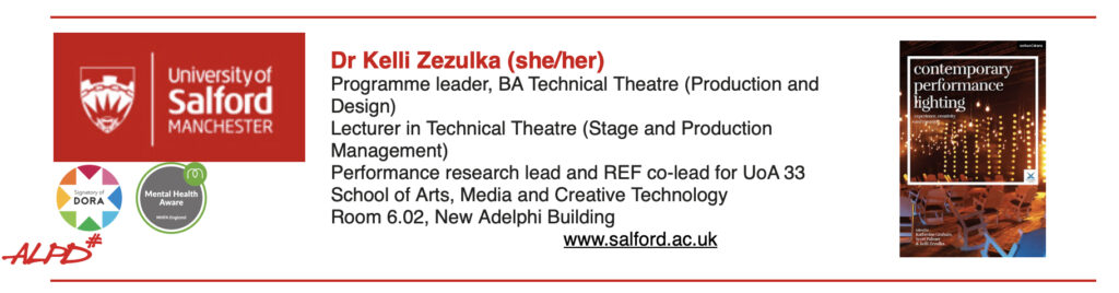 Kelli Zezulka is docent technisch theater aan de Universiteit van Salford. Als productiemanager en lichtontwerper was Kelli tien jaar lang redacteur van Focus, het tijdschrift van de Britse Association of Lighting Production and Design. Ze is ook co-redacteur van Contemporary Performance Lighting, met Katherine Graham en Scott Palmer, dat in februari 2023 is gepubliceerd.